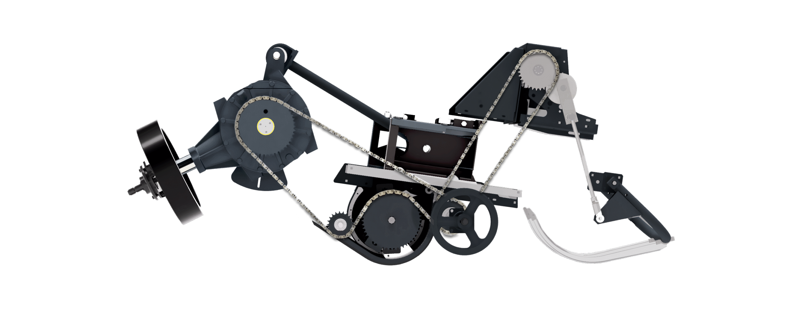 Correa de transmisión trapezoidal para eliminar los problemas asociados con la transmisión por cadena, lo que facilita su adquisición e instalación cuando sea necesario, al tiempo que aumenta la seguridad debido a su capacidad de deslizamiento en caso de sobrecargas, obstáculos repentinos o accidentes.