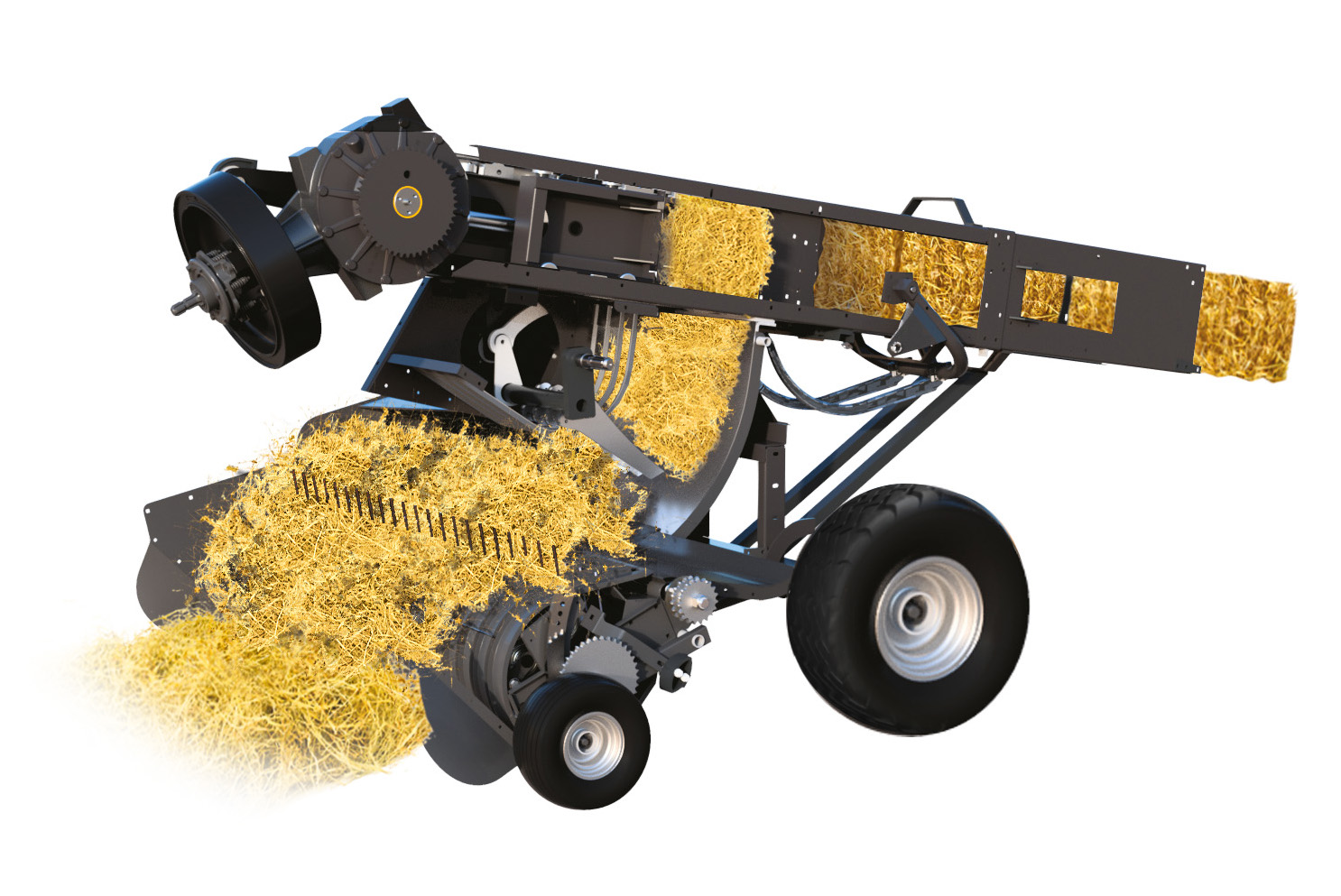 Estructura robusta de soporte de carga diseñada para un uso de alta intensidad, con cinco grandes conjuntos de barras dentadas equipados con quince cojinetes con brida de alta calidad. Hasta ciento diez dientes altamente flexibles y dos grandes cócleas de alta capacidad aseguran la recogida y el transporte rápidos y uniformes del producto a la precámara, garantizando balas con una forma experta.