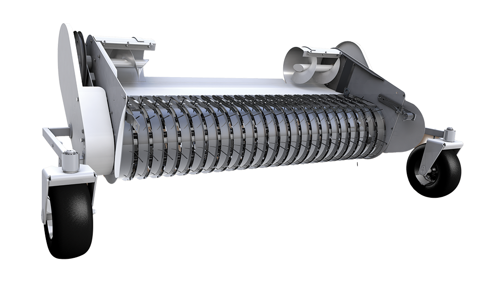 Equipado con ruedas de apoyo, elevación hidráulica, ajustable directamente desde el asiento del conductor para actuar rápidamente ante las cambiantes condiciones del campo. El movimiento contrarrotatorio de los sinfines facilita un flujo rápido y eficiente del material hacia el canal de alimentación.